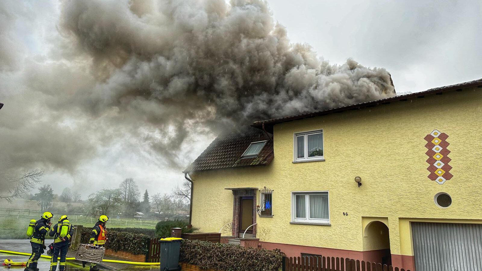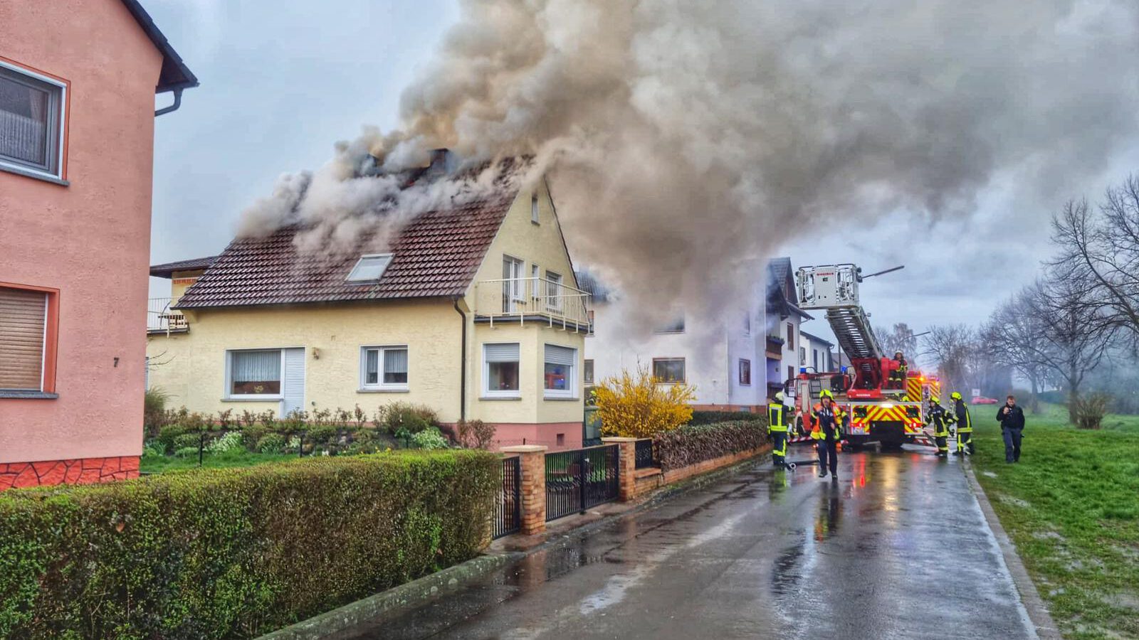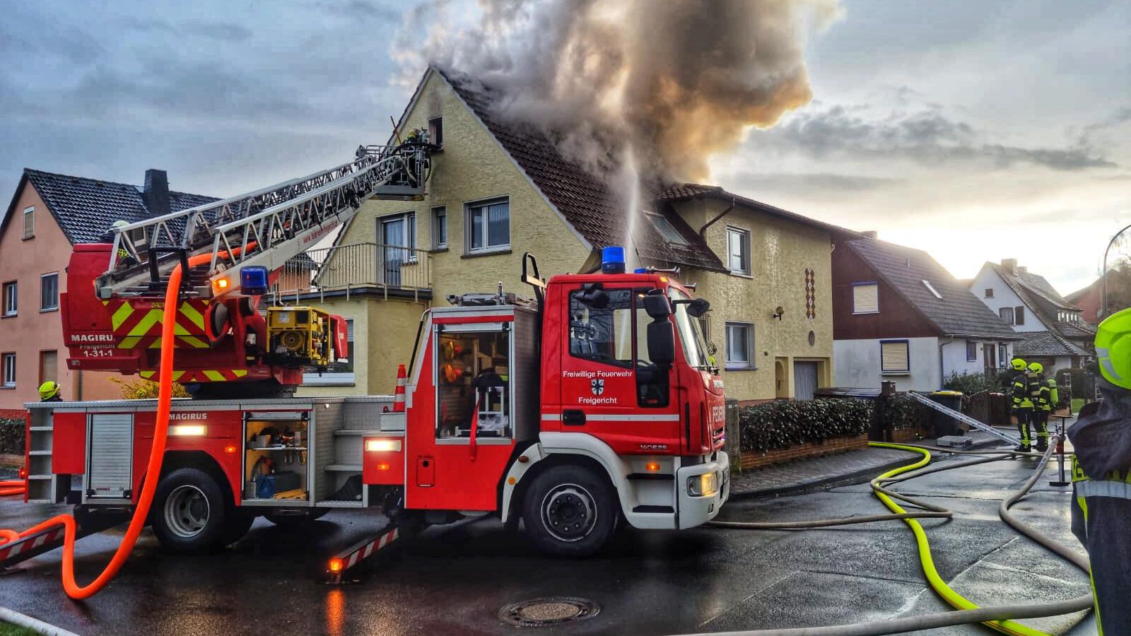 Am Sonntagabend um kurz nach 18:30 Uhr wurde die Feuerwehr Hasselroth, die Drehleiter Freigericht und ein Rettungswagen zu einem Dachstuhlbrand in die Niedermittlauer Jägerbuschstraße alarmiert. Auf Anfahrt zur Einsatzstelle informierte die Leitstelle, dass weitere Notrufe eingegangen sind, die noch Personen im Gebäude vermuten ließen. Durch den Einsatzleiter wurde das Einsatzstichwort umgehend auf „Feuer Menschenleben in Gefahr“ erhöht. Bereits vier Minuten nach Alarmierung waren die ersten Einsatzkräfte vor Ort, die einen pulsierenden Brand des gesamten Dachstuhls vorfanden, der weit über die Ortsgrenze sichtbar war. Umgehend wurde ein Trupp unter Atemschutz zur Brandbekämpfung in das Gebäude entsandt. Parallel wurden Löschmaßnahmen über die Drehleiter und einem weiteren Trupp im Außenangriff vorbereitet. Im Einsatzverlauf wurden sechs Trupps unter Atemschutz eingesetzt, die einen schnellen Einsatzerfolg gewährleisteten. Die Hausbewohnerin wurde von sehr aufmerksamen Nachbarn kurz vor Eintreffen der Feuerwehr aus dem Haus begleitet. Das Haus ist bis auf Weiteres unbewohnbar. Die Polizei hat Ermittlungen zur Brandursache aufgenommen. Die Feuerwehr war mit über 50 Blauröcken vor Ort. Verletzt wurde glücklicherweise niemand.