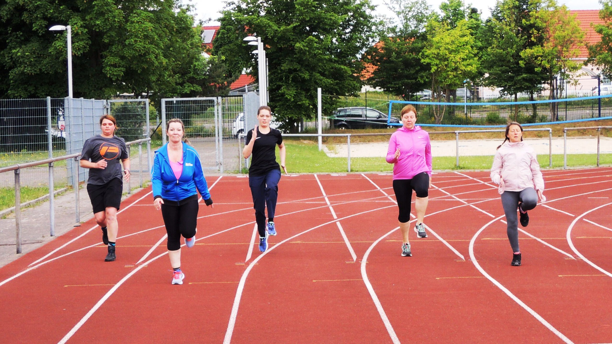 Vorne, von links: Jacqueline Kunzmann, Mathilda Glaesmann, Kerstin Grünwald, Judith Frank, Jennifer Dedisch - Das Logo der DFM