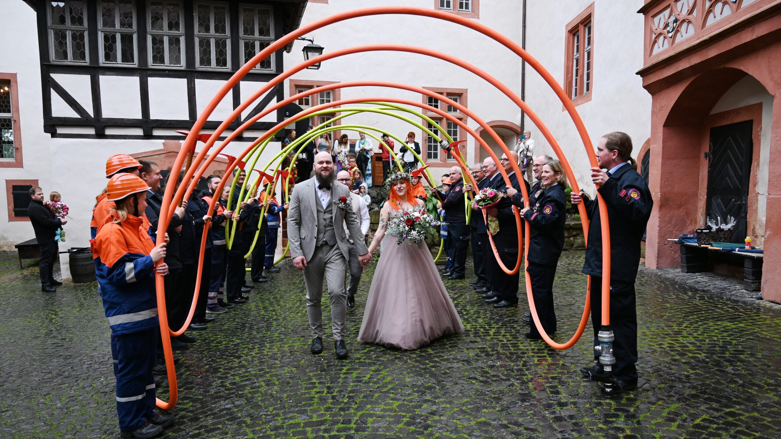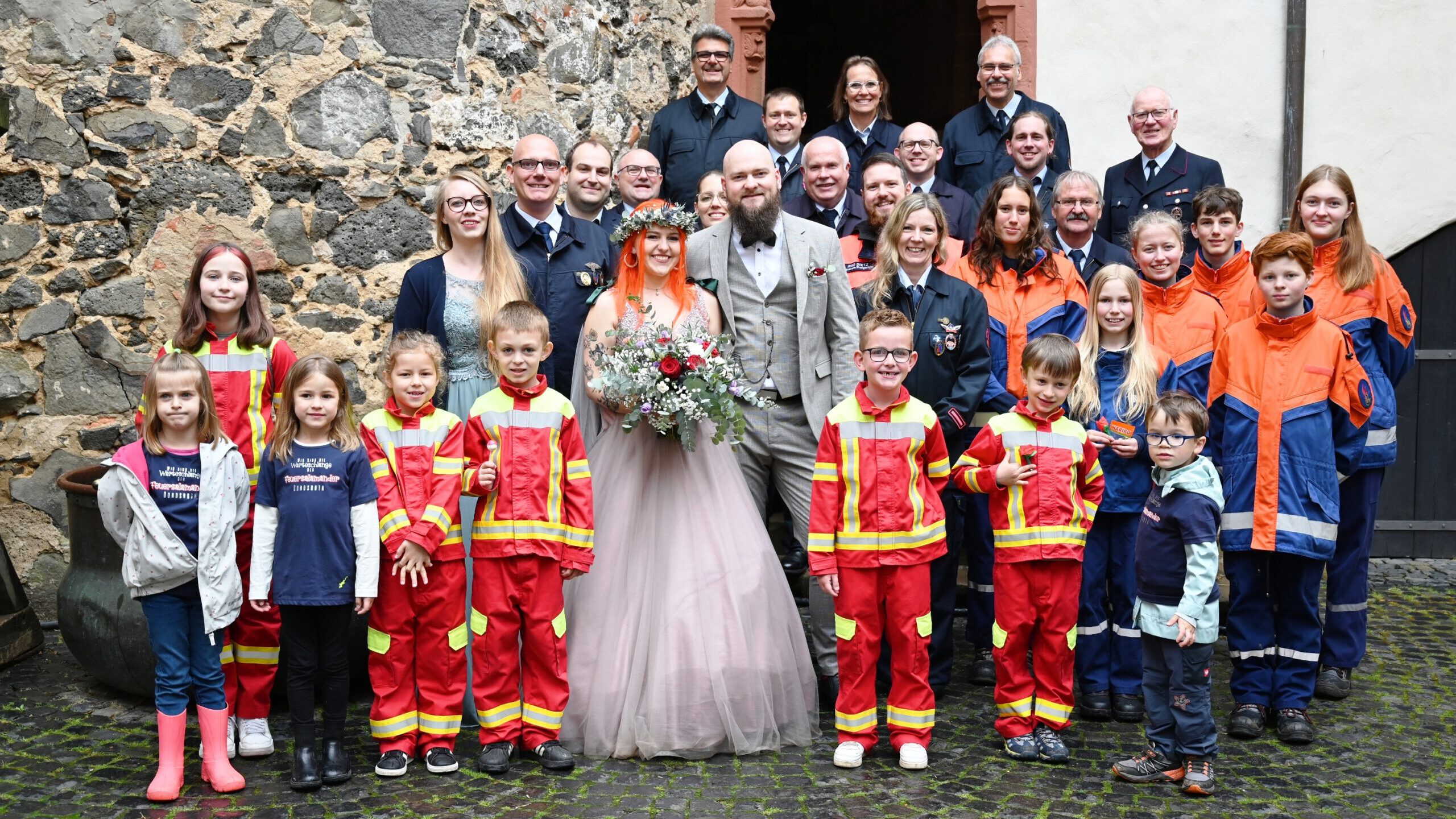 Vor einigen Wochen schon gab es in der Gondsrother Feuerwehr eine richtige Feuerwehrhochzeit. Der stellvertretende Jugendwart Denis Fröhlich hat seine langjährige Freundin und Betreuerin der Kinderfeuerwehr Tanja Pürzl geheiratet. Selbstverständlich wurde auch deren Wunsch nachgekommen das Löschfahrzeug als Hochzeitsauto verwenden zu dürfen, um eine standesgemäße Transportmöglichkeit zu erhalten. Wie hätte man die Anfrage auch ausschlagen sollen, denn beide zusammen engagieren sich schon insgesamt 34 Jahre in der Feuerwehr. Wie es in Gondsroth Tradition ist, gibt es nach der Hochzeit ein Spalier, was diesmal besonders groß ausfiel. Eine Abordnung von Einsatzabteilung, zusammen mit Jugend- und Kinderfeuerwehr fuhren dazu auf die Ronneburg und empfingen die beiden nach dem Standesamt. Die Feuerwehr Gondsroth wünscht den beiden alles Glück für die Zukunft!