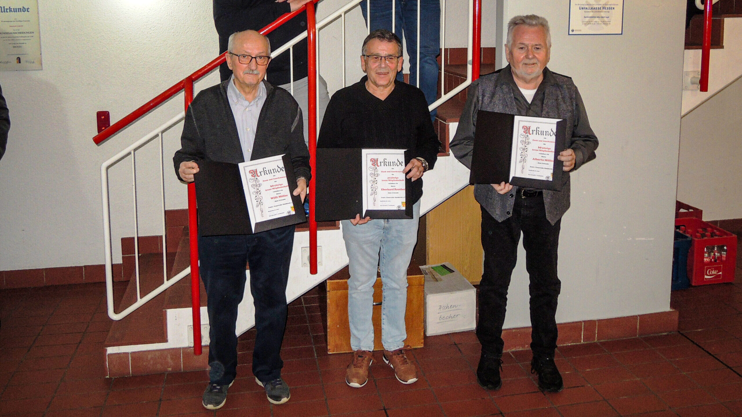 Urkunden/Präsente für langjährige Mitgliedschaften im Förderverein konnten für 40 Jahre Eberhard Reuther und für 60 Jahre Willi Möller und Alberto Müller in Empfang nehmen.