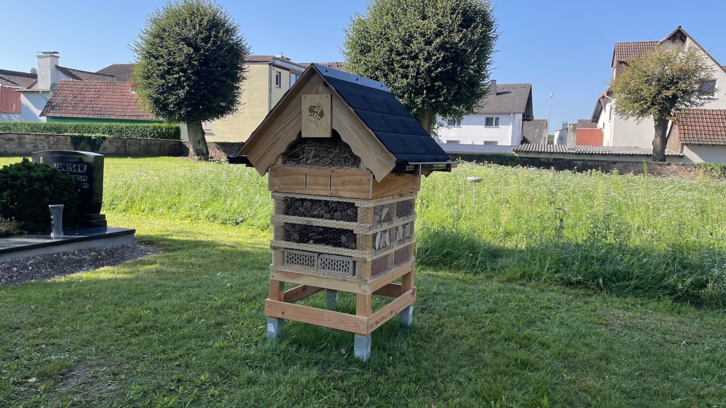 Aufgestellt wurde das Hotel im Beisein unseres Bürgermeisters Matthias Pfeifer, vieler Eltern sowie Vertretern des Fördervereins der Feuerwehr Niedermittlau am 9. September 2023 auf dem Niedermittlauer Friedhof. Dort wurde durch den Bauhof bereits vor einiger Zeit eine große Blühwiese angelegt, und was lag da näher als dafür dieses Insektenhotel zu bauen.